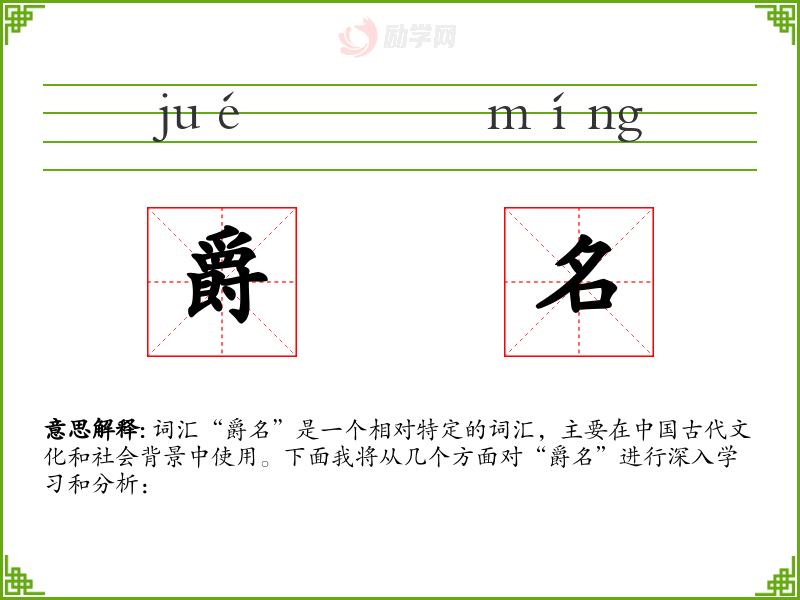 词汇“爵名”是一个相对特定的词汇,主要在*古代文化和社会背景中使用。下面我将从几个方面对“爵名”进行深入学和分析: