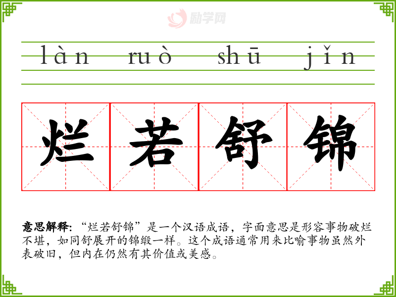 “烂若舒锦”这个成语不仅丰富了汉语的表达,也传递了一种深刻的文化价值观。它提醒我们在评价事物时,不应仅看表面,而应深入挖掘其内在的价值和美感。在语言学*和表达中,理解和运用这样的成语能够提升我们的语言能力和文化素养。