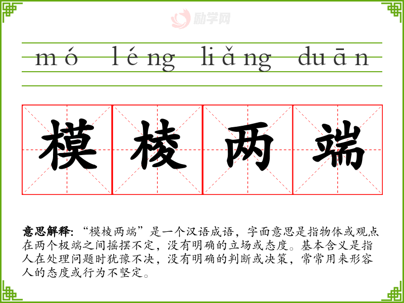“模棱两端”是一个汉语成语,字面意思是指物体或观点在两个极端之间摇摆不定,没有明确的立场或态度。基本含义是指人在处理问题时犹豫不决,没有明确的判断或决策,常常用来形容人的态度或行为不坚定。