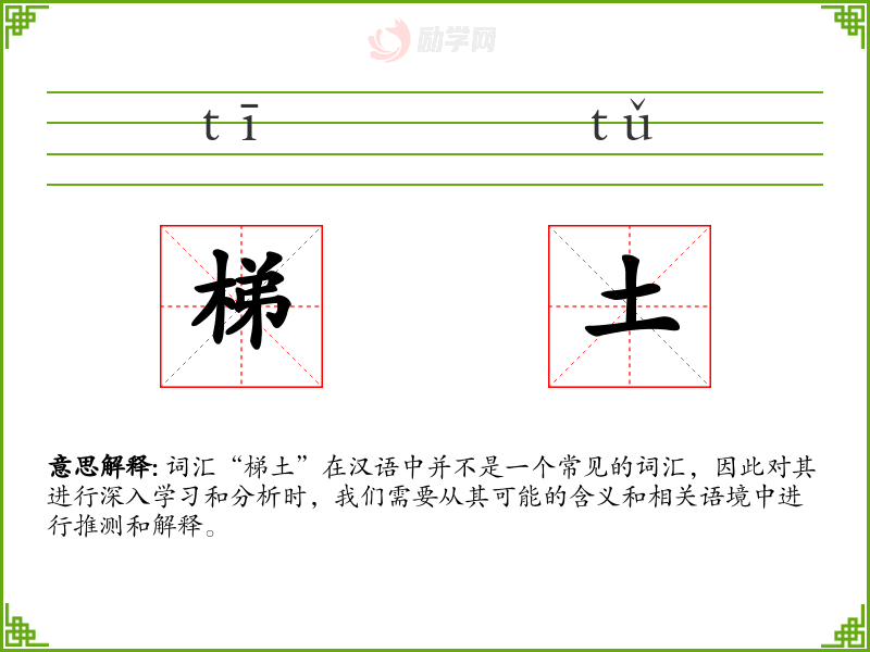 词汇“梯土”在汉语中并不是一个常见的词汇,因此对其进行深入学*和分析时,我们需要从其可能的含义和相关语境中进行推测和解释。