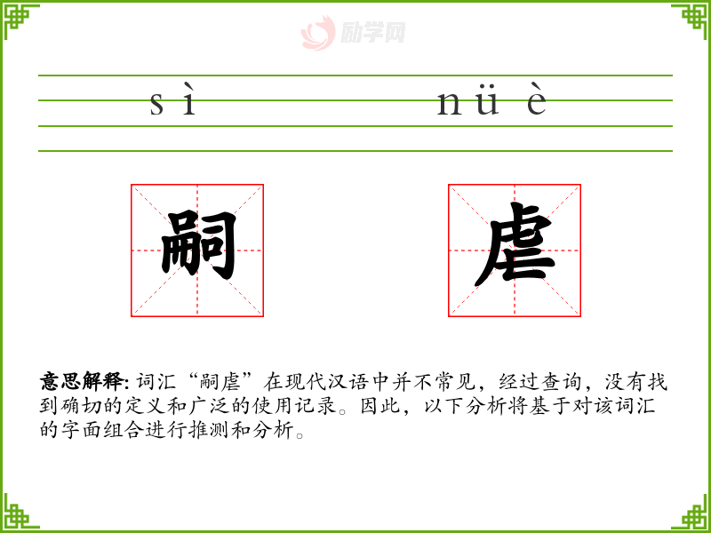 由于“嗣虐”不是一个常用词汇,其词源和演变难以考证。但从字面组合来看,它可能是由“嗣”和“虐”两个常用汉字组合而成,用以表达特定的负面继承行为。