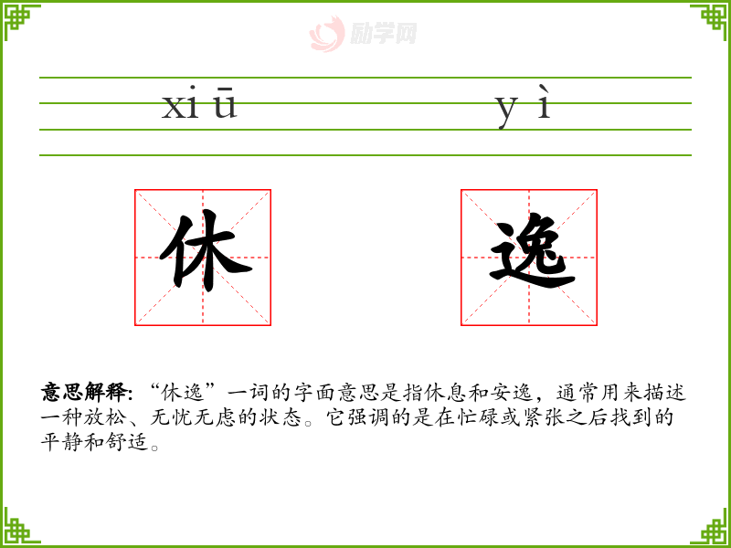 “休逸”一词的字面意思是指休息和安逸,通常用来描述一种放松、无忧无虑的状态。它强调的是在忙碌或紧张之后找到的平静和舒适。