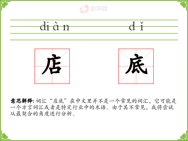 词汇“店底”在中文里并不是一个常见的词汇,它可能是一个方言词汇或者是特定行业中的术语。由于其不常见,我将尝试从最契合的角度进行分析。
