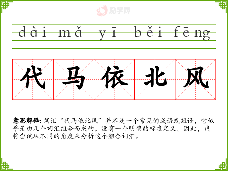 词汇“代马依北风”并不是一个常见的成语或短语,它似乎是由几个词汇组合而成的,没有一个明确的标准定义。因此,我将尝试从不同的角度来分析这个组合词汇。