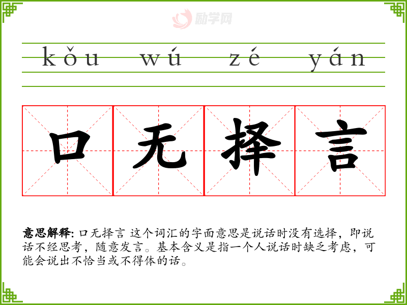 口无择言 这个词汇的字面意思是说话时没有选择,即说话不经思考,随意发言。基本含义是指一个人说话时缺乏考虑,可能会说出不恰当或不得体的话。