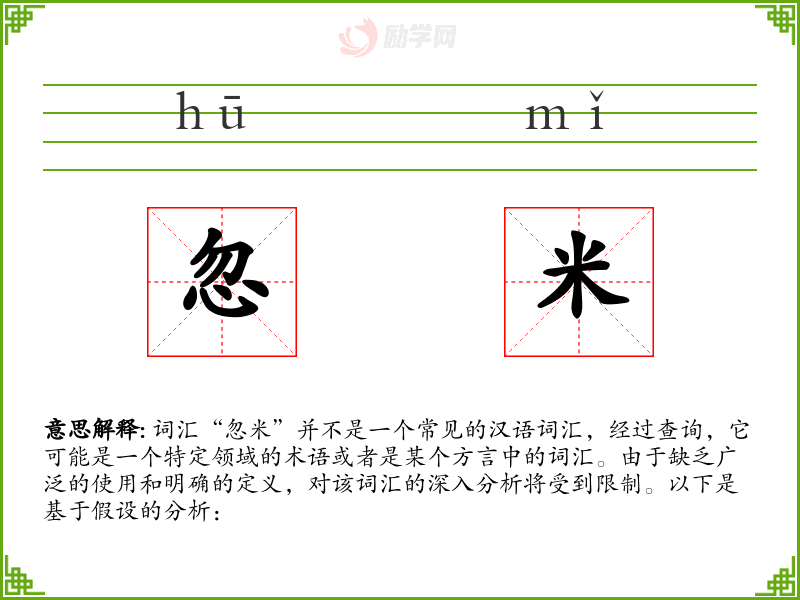词汇“忽米”并不是一个常见的汉语词汇,经过查询,它可能是一个特定领域的术语或者是某个方言中的词汇。由于缺乏广泛的使用和明确的定义,对该词汇的深入分析将受到限制。以下是基于假设的分析: