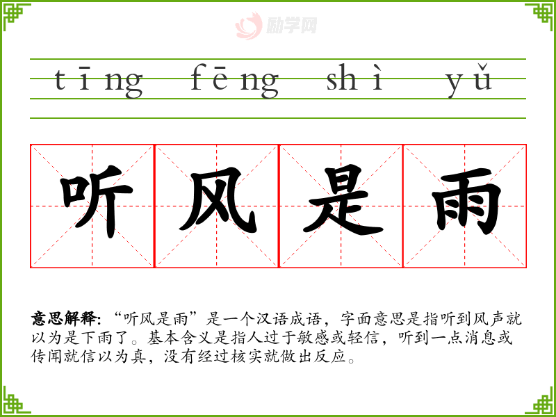 “听风是雨”是一个汉语成语,字面意思是指听到风声就以为是下雨了。基本含义是指人过于敏感或轻信,听到一点消息或传闻就信以为真,没有经过核实就做出反应。