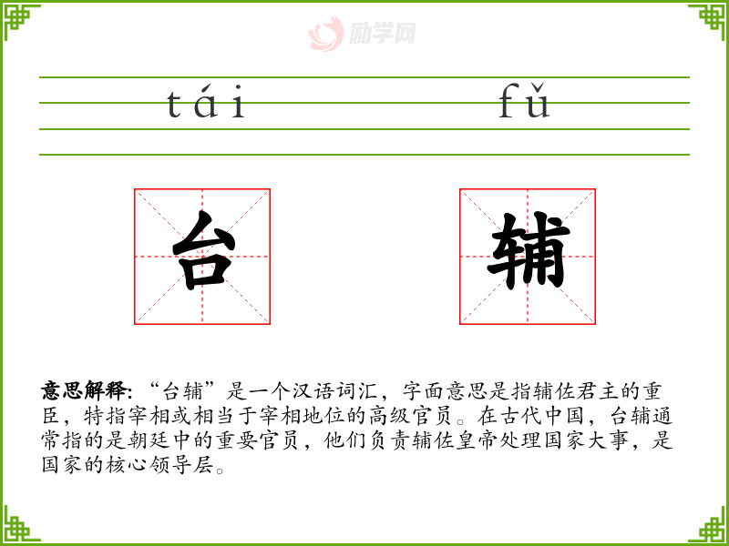 在日常生活中,这个词可能不太常用,但在阅读历史书籍或参与政治讨论时,了解“台辅”的含义可以帮助更深入地理解相关内容。