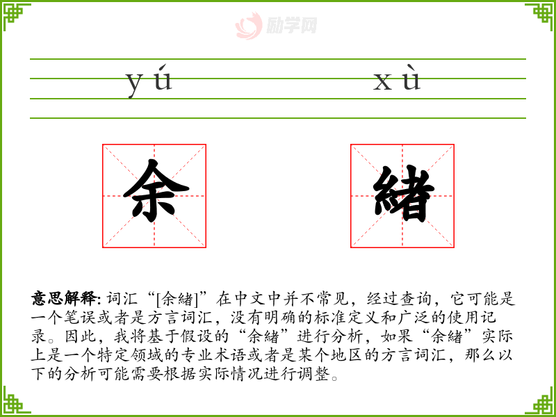 词汇“[余緖]”在中文中并不常见,经过查询,它可能是一个笔误或者是方言词汇,没有明确的标准定义和广泛的使用记录。因此,我将基于假设的“余緖”进行分析,如果“余緖”实际上是一个特定领域的专业术语或者是某个地区的方言词汇,那么以下的分析可能需要根据实际情况进行调整。