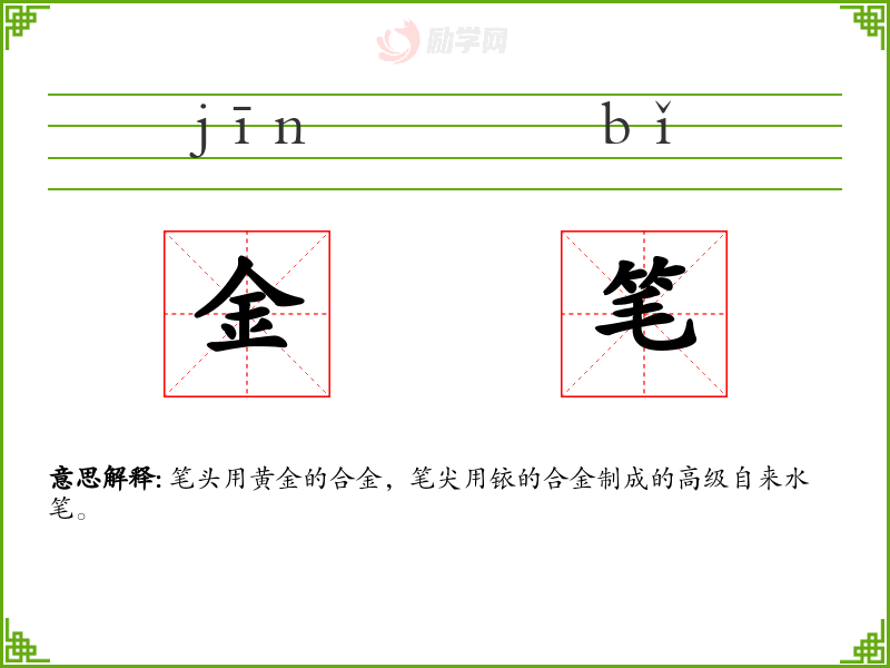 金笔的意思是:笔头用黄金的合金,笔尖用铱的合金制成的高级自来水笔。