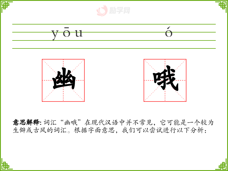 词汇“幽哦”在现代汉语中并不常见,它可能是一个较为生僻或古风的词汇。根据字面意思,我们可以尝试进行以下分析:
