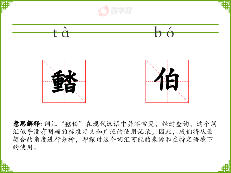 词汇“濌伯”在现代汉语中并不常见,经过查询,这个词汇似乎没有明确的标准定义和广泛的使用记录。因此,我们将从最契合的角度进行分析,即探讨这个词汇可能的来源和在特定语境下的使用。