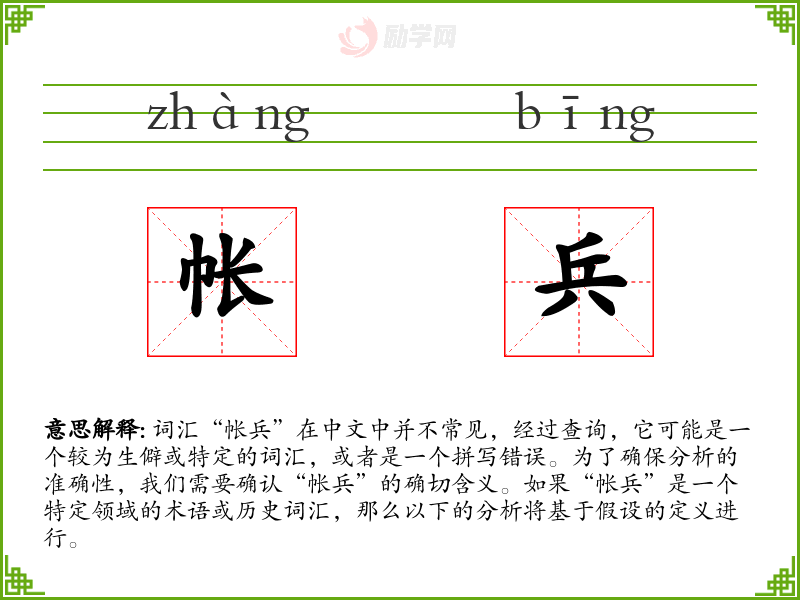 词汇“帐兵”在中文中并不常见,经过查询,它可能是一个较为生僻或特定的词汇,或者是一个拼写错误。为了确保分析的准确性,我们需要确认“帐兵”的确切含义。如果“帐兵”是一个特定领域的术语或历史词汇,那么以下的分析将基于假设的定义进行。
