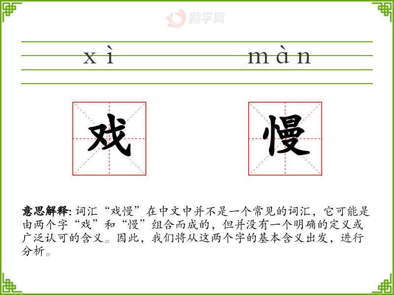 通过对“戏慢”这个假设性词汇的分析,我们可以看到,即使是组合词汇,也需要有明确的定义和广泛的使用才能成为有效的语言单位。在语言学习和表达中,理解和运用词汇的基本含义是非常重要的。