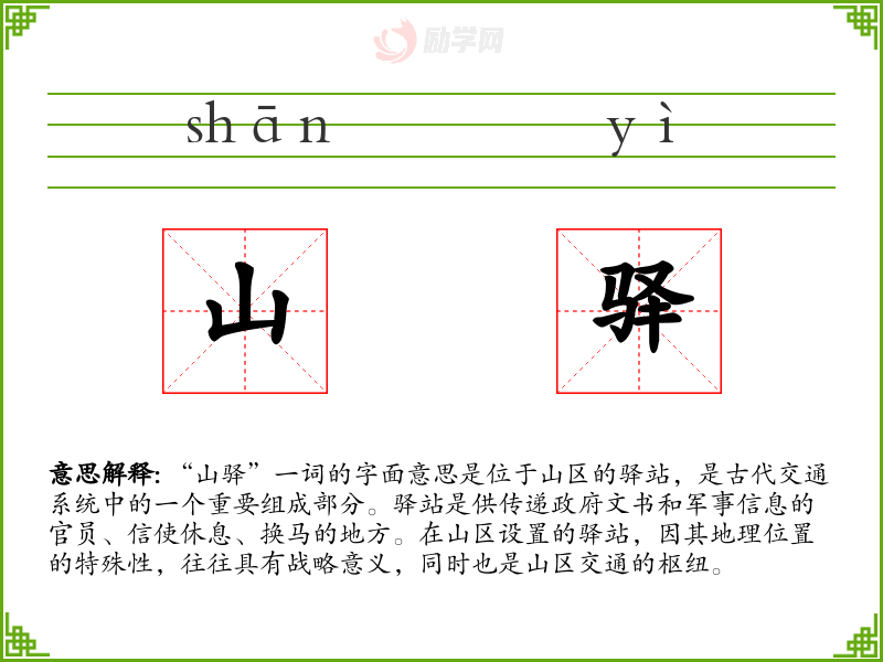 在文学作品中,“山驿”常被用来营造一种孤寂、遥远或历史沧桑的氛围。在口语中,这个词可能不太常用,但在历史、旅游、地理等专业领域,它是一个较为专业的术语。