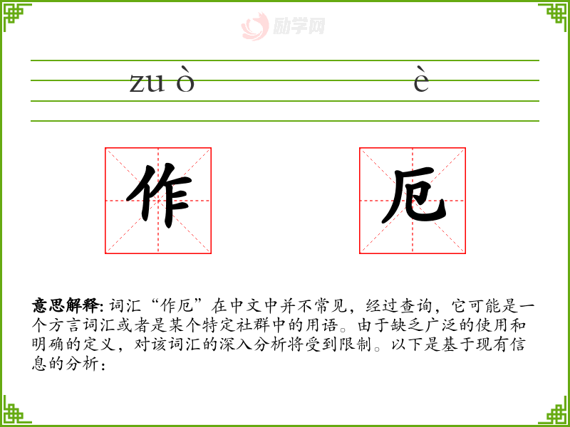 由于“作厄”不是一个标准汉语词汇,对其的理解和应用受到限制。在语言学习和表达中,了解和使用标准汉语词汇更为重要。如果遇到类似的不明确词汇,建议寻求具体的语境和背景信息,以便更好地理解和使用。
