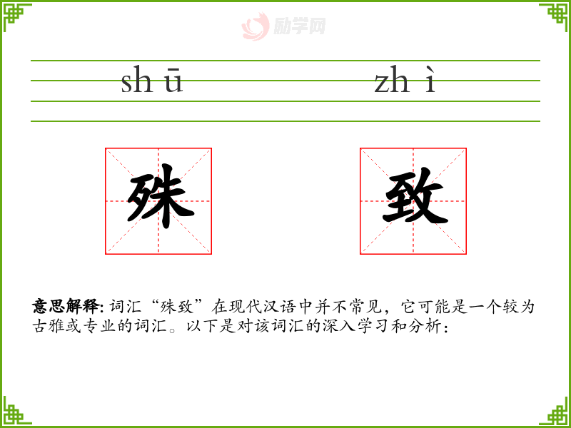 词汇“殊致”在现代汉语中并不常见,它可能是一个较为古雅或专业的词汇。以下是对该词汇的深入学*和分析: