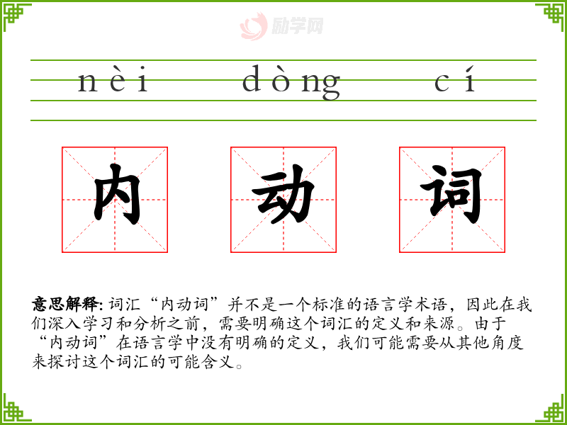 词汇“内动词”并不是一个标准的语言学术语,因此在我们深入学习和分析之前,需要明确这个词汇的定义和来源。由于“内动词”在语言学中没有明确的定义,我们可能需要从其他角度来探讨这个词汇的可能含义。
