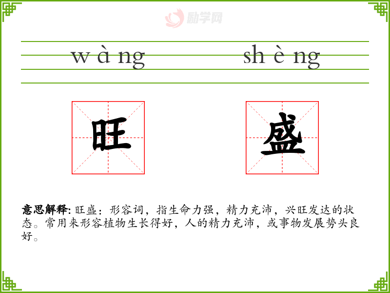 旺盛:形容词,指生命力强,精力充沛,兴旺发达的状态。常用来形容植物生长得好,人的精力充沛,或事物发展势头良好。