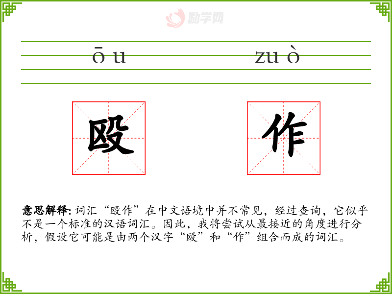 词汇“殴作”在中文语境中并不常见,经过查询,它似乎不是一个标准的汉语词汇。因此,我将尝试从最接近的角度进行分析,假设它可能是由两个汉字“殴”和“作”组合而成的词汇。