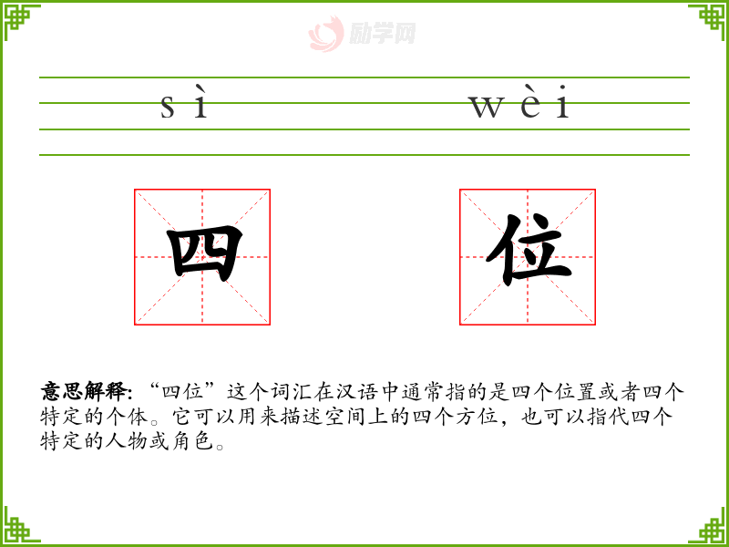 “四位”这个词汇在汉语中通常指的是四个位置或者四个特定的个体。它可以用来描述空间上的四个方位,也可以指代四个特定的人物或角色。