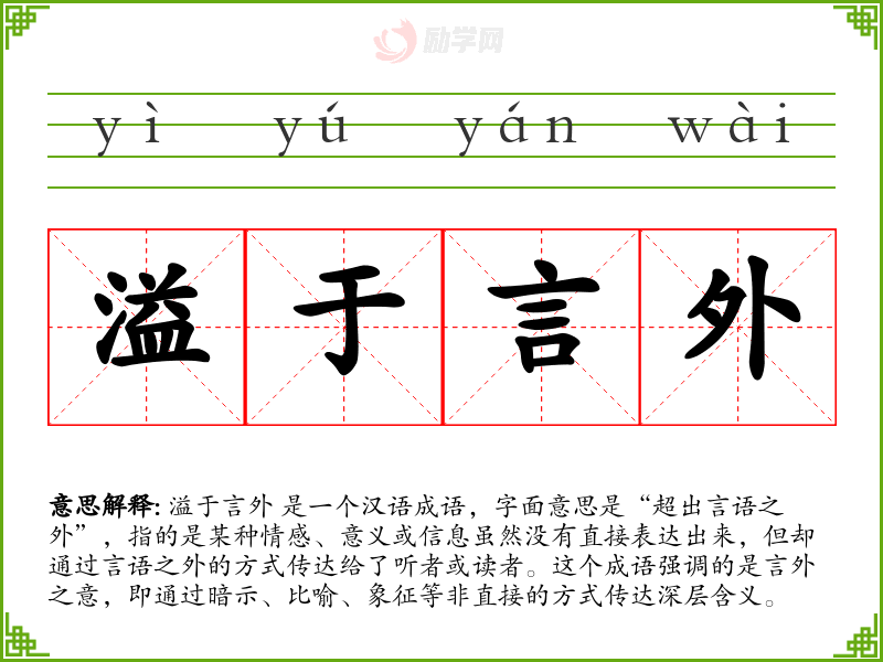 溢于言外 是一个汉语成语,字面意思是“超出言语之外”,指的是某种情感、意义或信息虽然没有直接表达出来,但却通过言语之外的方式传达给了听者或读者。这个成语强调的是言外之意,即通过暗示、比喻、象征等非直接的方式传达深层含义。
