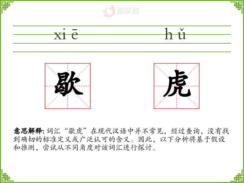 由于“歇虎”不是一个常用词汇,个人应用可能非常有限。如果遇到,可能是在特定的文学作品或方言环境中。
