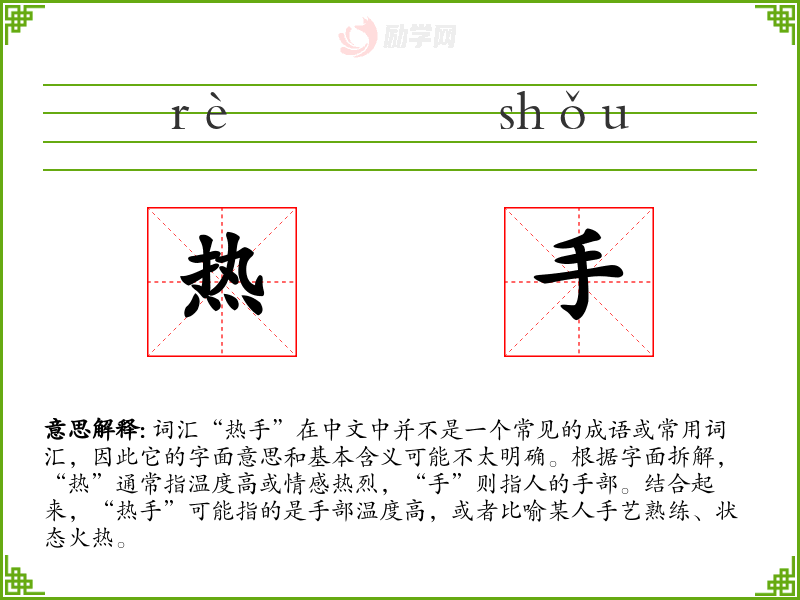 - 文学:在文学作品中,可能用来形容某人热情高涨,如“他的热情如热手,感染了周围的人”。