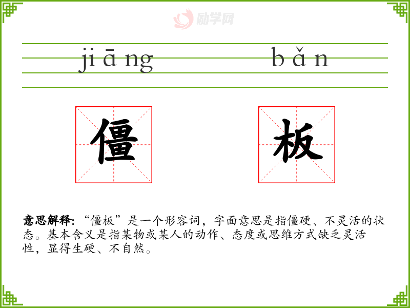 “僵板”是一个形容词,字面意思是指僵硬、不灵活的状态。基本含义是指某物或某人的动作、态度或思维方式缺乏灵活性,显得生硬、不自然。