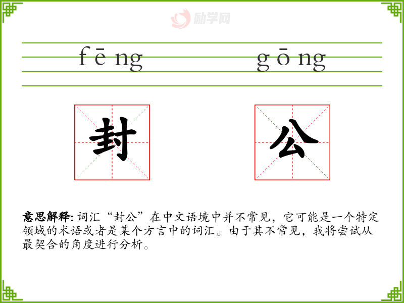 词汇“封公”在中文语境中并不常见,它可能是一个特定领域的术语或者是某个方言中的词汇。由于其不常见,我将尝试从最契合的角度进行分析。