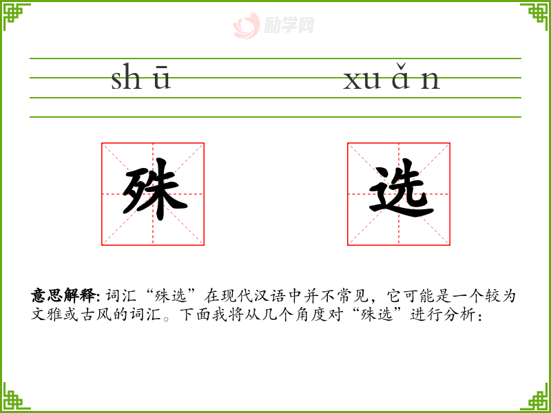 词汇“殊选”在现代汉语中并不常见,它可能是一个较为文雅或古风的词汇。下面我将从几个角度对“殊选”进行分析: