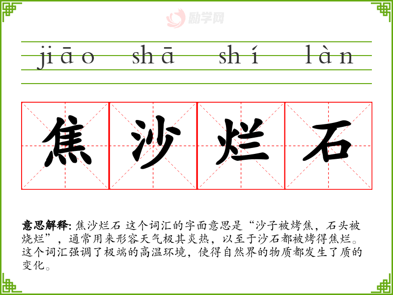焦沙烂石 这个词汇的字面意思是“沙子被烤焦,石头被烧烂”,通常用来形容天气极其炎热,以至于沙石都被烤得焦烂。这个词汇强调了极端的高温环境,使得自然界的物质都发生了质的变化。