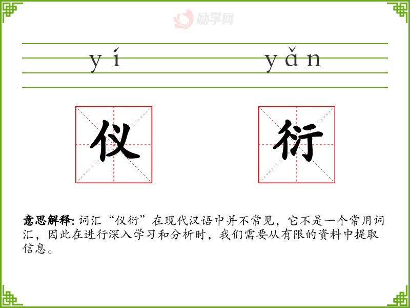 词汇“仪衍”在现代汉语中并不常见,它不是一个常用词汇,因此在进行深入学*和分析时,我们需要从有限的资料中提取信息。