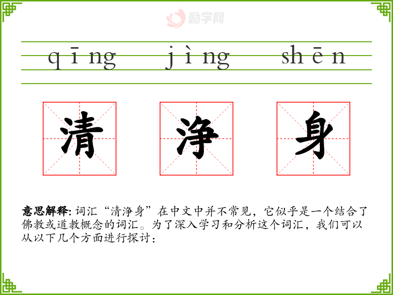 词汇“清浄身”在中文中并不常见,它似乎是一个结合了*或道教概念的词汇。为了深入学和分析这个词汇,我们可以从以下几个方面进行探讨: