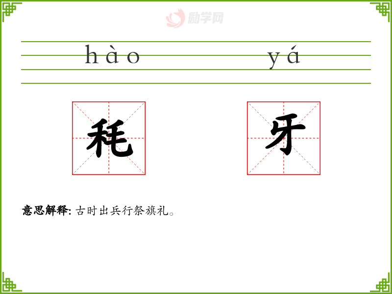 秏牙的意思是:古时出兵行祭旗礼。