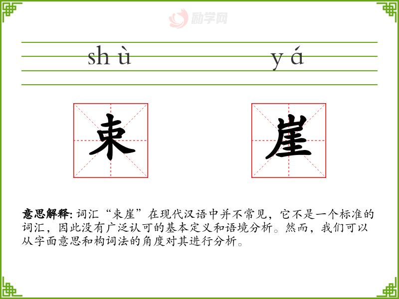 词汇“束崖”在现代汉语中并不常见,它不是一个标准的词汇,因此没有广泛认可的基本定义和语境分析。然而,我们可以从字面意思和构词法的角度对其进行分析。