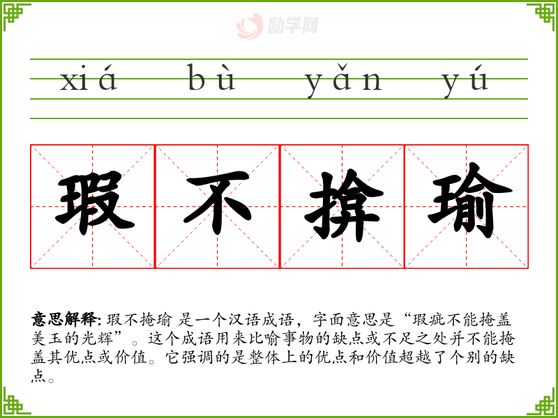 瑕不掩瑜 出自《左传·宣公十五年》:“瑕不掩瑜,瑜不掩瑕,忠也。”原意是指玉石上的瑕疵不能掩盖其美玉的光辉,后来引申为人的缺点不能掩盖其优点。