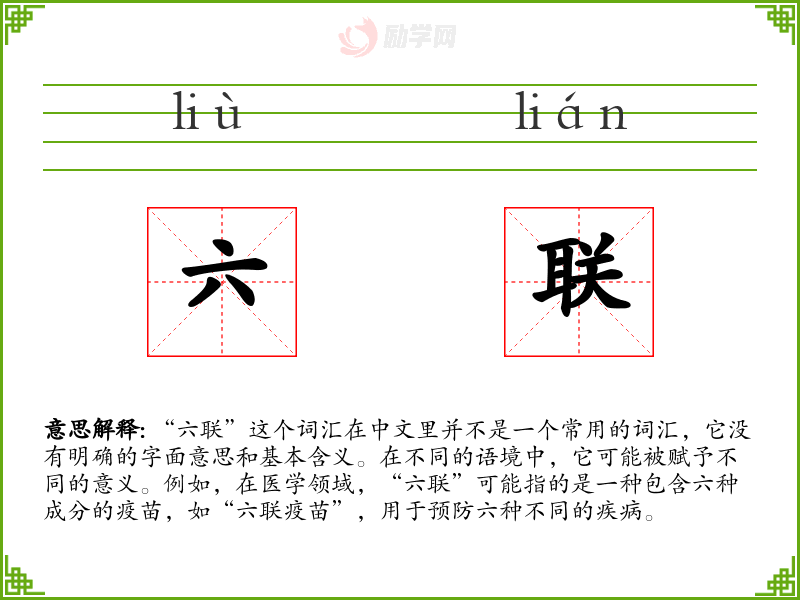“六联”这个词汇在中文里并不是一个常用的词汇,它没有明确的字面意思和基本含义。在不同的语境中,它可能被赋予不同的意义。例如,在医学领域,“六联”可能指的是一种包含六种成分的疫苗,如“六联疫苗”,用于预防六种不同的疾病。