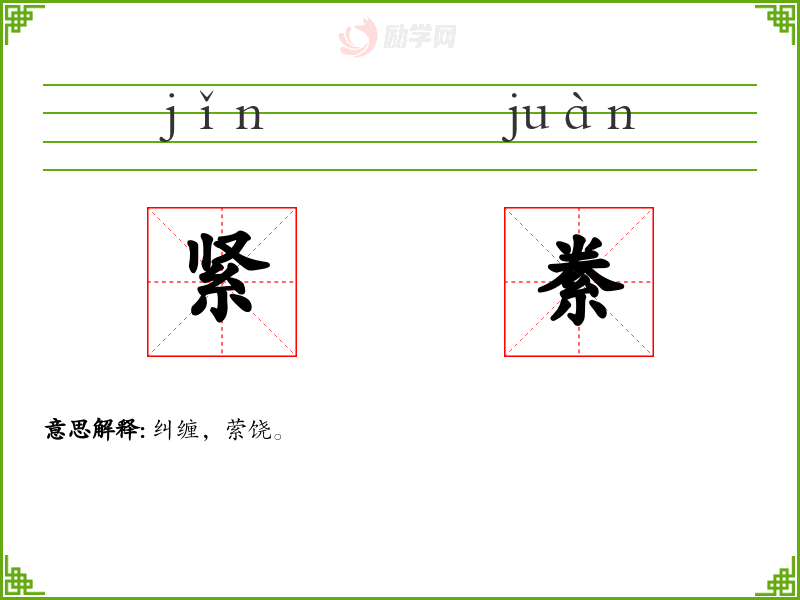 紧[ jǐn ] 1. (会意。从臤(qiān),坚。从糸(mì),细丝。本义:缠丝急)。 2. 同本义。 【引证】 《说文》-紧,缠丝急也。 傅毅《舞赋》-弛紧急之弦张兮。 [更多解释]