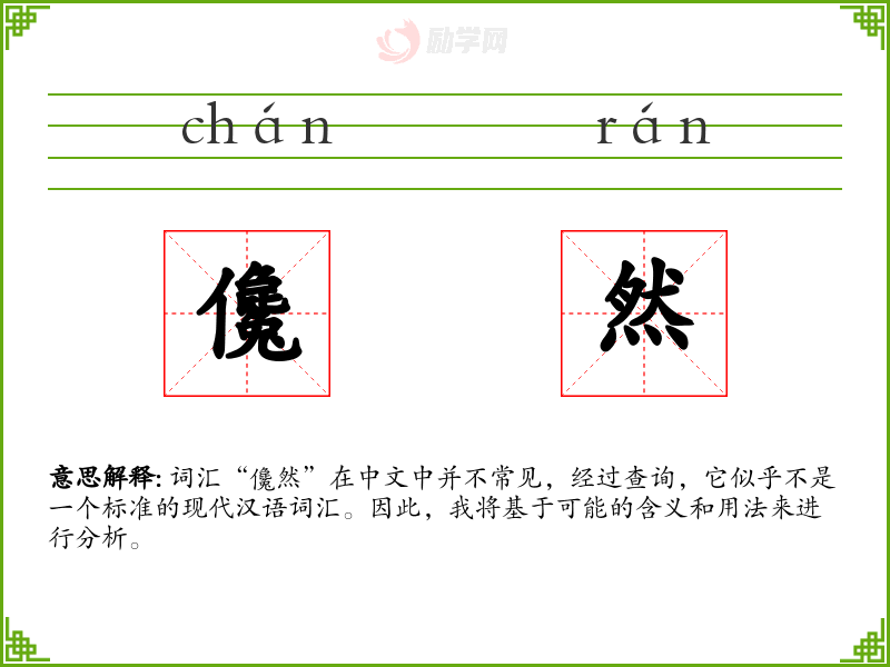 由于“儳然”不是一个已知词汇,我对它的理解有限。在语言学习和表达中,了解和使用标准词汇是非常重要的,这有助于清晰和有效地沟通。