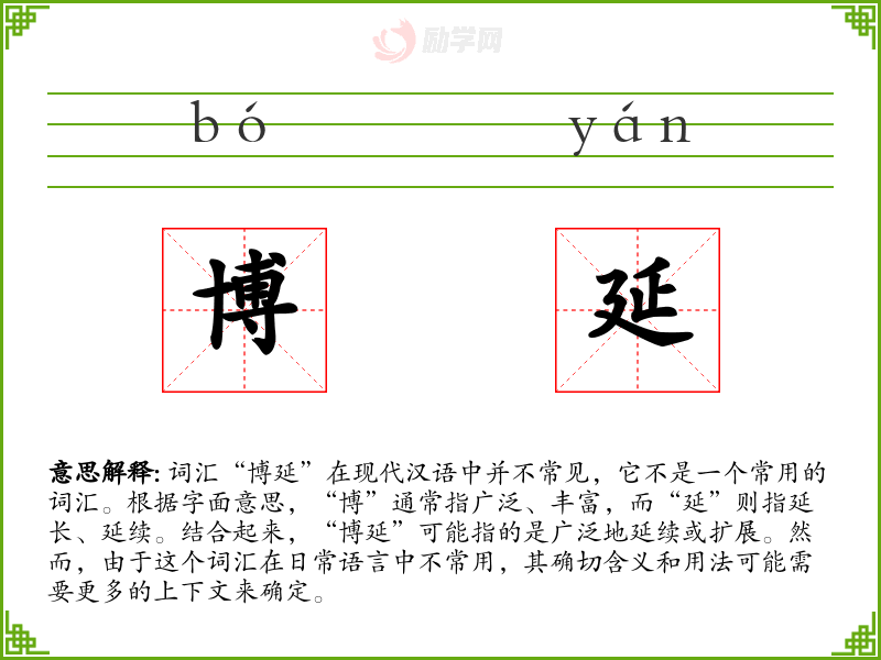 - 词源:由于“博延”不是一个常用词汇,其词源和演变可能不明确。