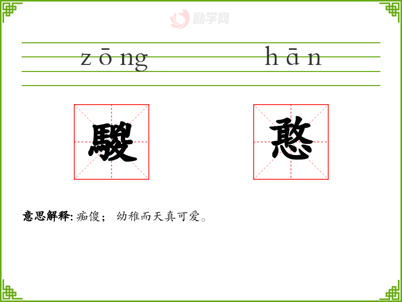 騣憨的意思是:痴傻; 幼稚而天真可爱。