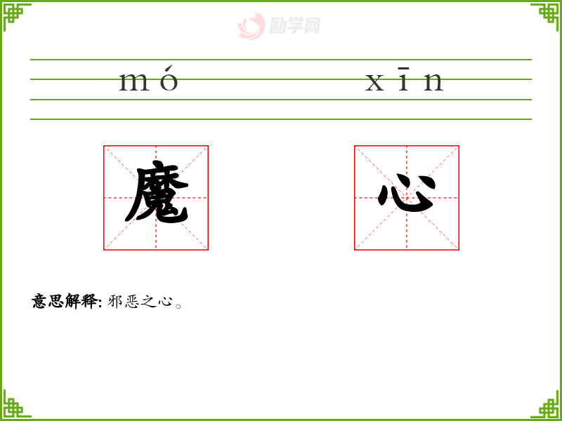 (形声。从鬼,麻声。本义:“魔罗”的略称。佛教把一切扰乱身心、破坏行善、妨碍修行的心理活动均称为“魔”)。