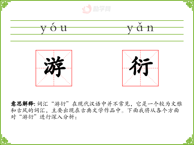 词汇“游衍”在现代汉语中并不常见,它是一个较为文雅和古风的词汇,主要出现在古典文学作品中。下面我将从各个方面对“游衍”进行深入分析:
