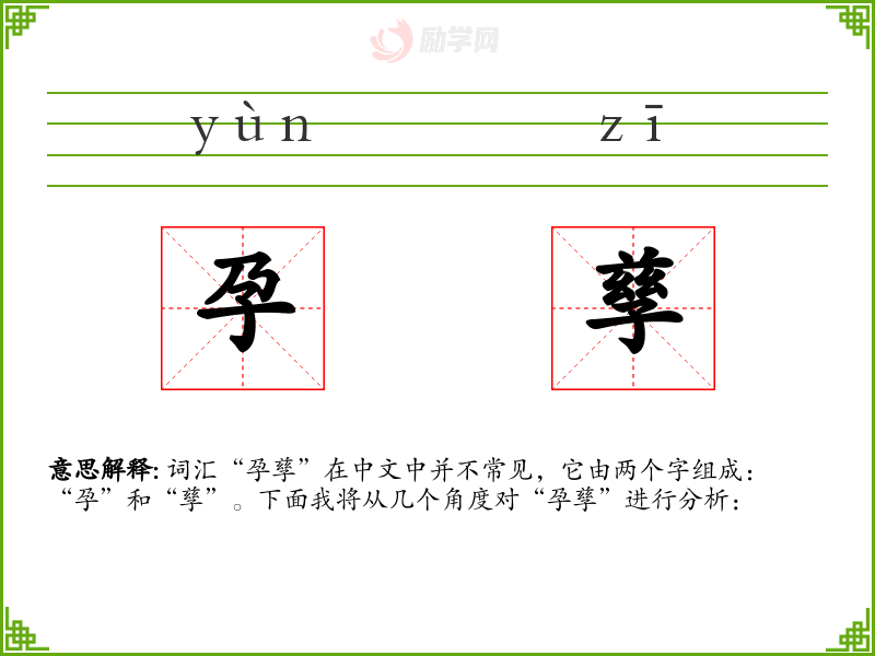 词汇“孕孳”在中文中并不常见,它由两个字组成:“孕”和“孳”。下面我将从几个角度对“孕孳”进行分析:
