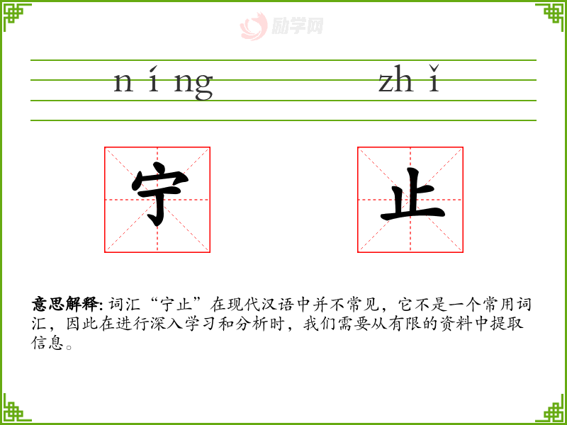 词汇“宁止”在现代汉语中并不常见,它不是一个常用词汇,因此在进行深入学*和分析时,我们需要从有限的资料中提取信息。