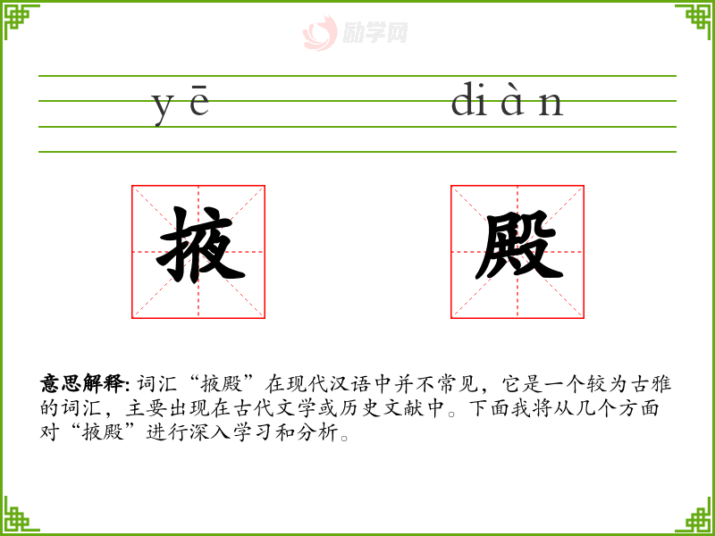 由于“掖殿”是一个较为生僻的词汇,日常生活中很少有机会使用。但在学*古代文学或历史时,了解这个词汇有助于更深入地理解相关内容。