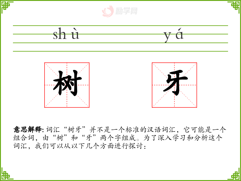 词汇“树牙”并不是一个标准的汉语词汇,它可能是一个组合词,由“树”和“牙”两个字组成。为了深入学习和分析这个词汇,我们可以从以下几个方面进行探讨: