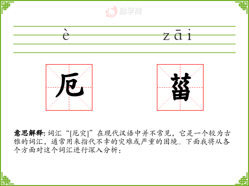 词汇“[厄灾]”在现代汉语中并不常见,它是一个较为古雅的词汇,通常用来指代不幸的灾难或严重的困境。下面我将从各个方面对这个词汇进行深入分析: