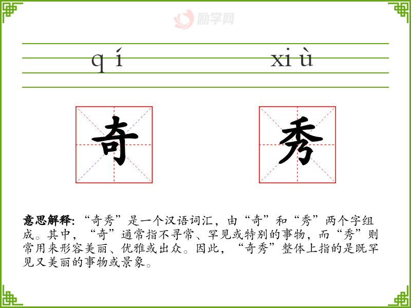 “奇秀”的词源较为直接,由“奇”和“秀”两个常用汉字组合而成。在古代文学中,“奇秀”常用来形容自然景观,如山水、花草等。随着时间的推移,其使用范围逐渐扩大,不仅限于自然景观,还可以用来形容艺术作品、人物等。